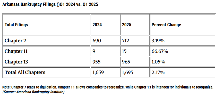 Meanwhile, Chapter 11 bankruptcies, which allow companies to reorganize, shot up 67% in the first quarter of 2025 compared with the same period a year ago. The quarter saw 15 Chapter 11s filed in Arkansas, according to the American Bankruptcy Institute of Alexandria, Virginia.
