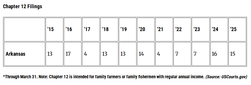 For the quarter that ended March 31, 15 Chapter 12 bankruptcies were filed in Arkansas. That pace is on track to easily surpass the filings for all of last year, which totaled 16, according to the Administrative Office of the U.S. Courts.