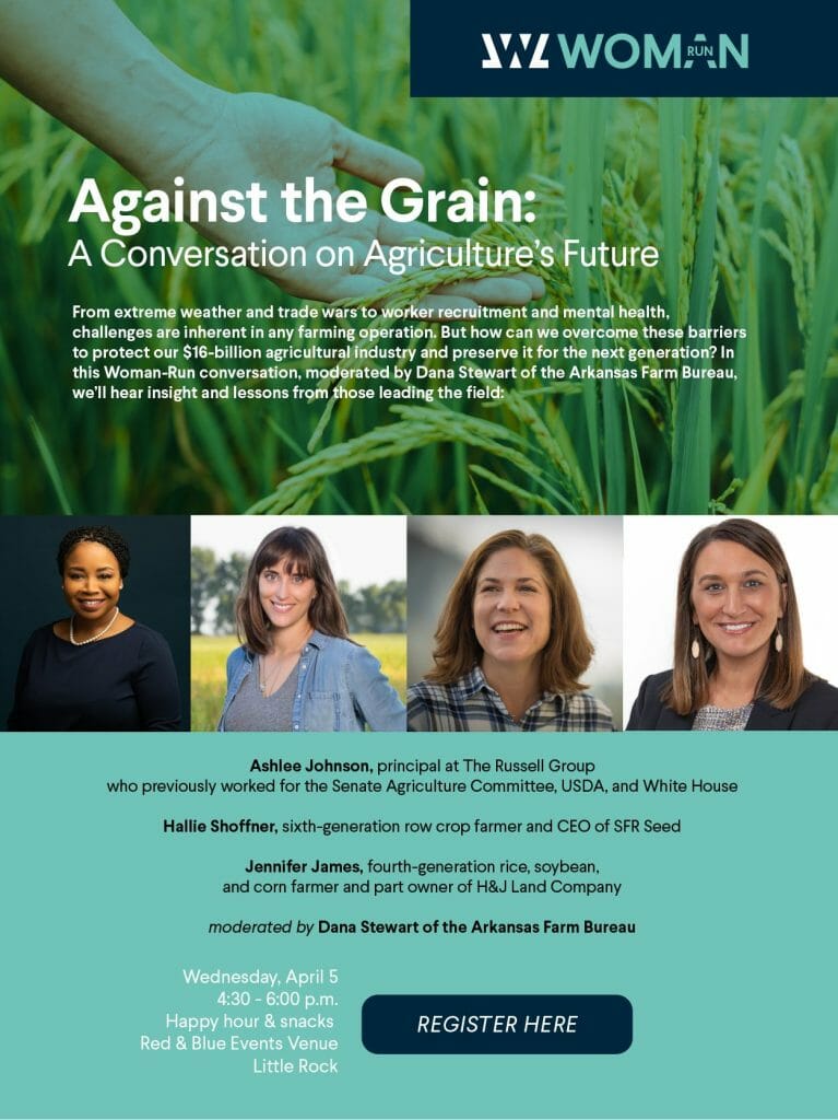 From extreme weather and trade wars to worker recruitment and mental health, challenges are inherent in any farming operation. But how can we overcome these barriers to protect our $16-billion agricultural industry and preserve it for the next generation? In this Woman-Run conversation, moderated by Dana Stewart of the Arkansas Farm Bureau, we’ll hear insight and lessons from those leading the field: