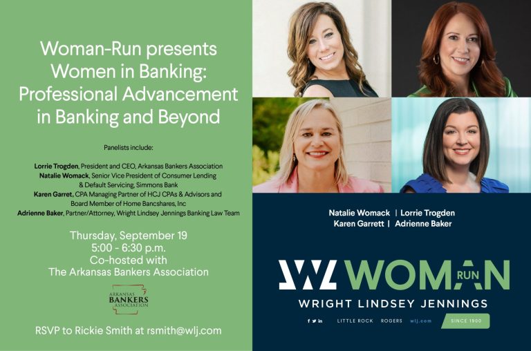 Join Woman-Run and the Arkansas Bankers Association for happy hour on September 19th to hear from a panel of banking industry professionals.