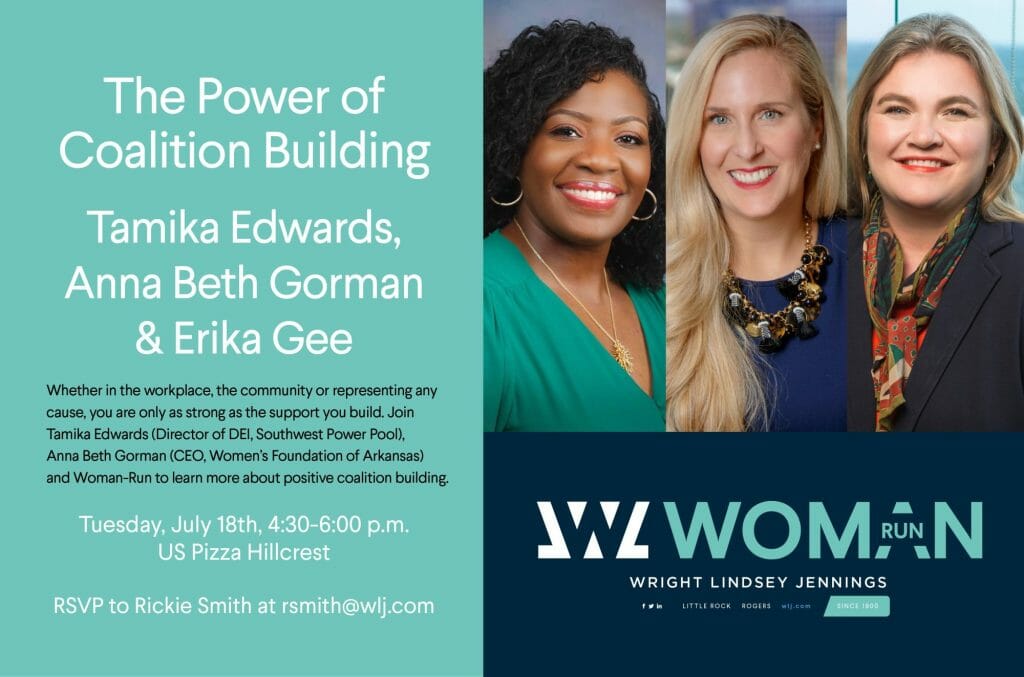 Whether in the workplace, the community or representing any cause, you are only as strong as the support you build. Join Tamika Edwards (Director of DEI, Southwest Power Pool), Anna Beth Gorman (CEO, Women’s Foundation of Arkansas) and WLJ’s Erika Gee to learn more about positive coalition building.
