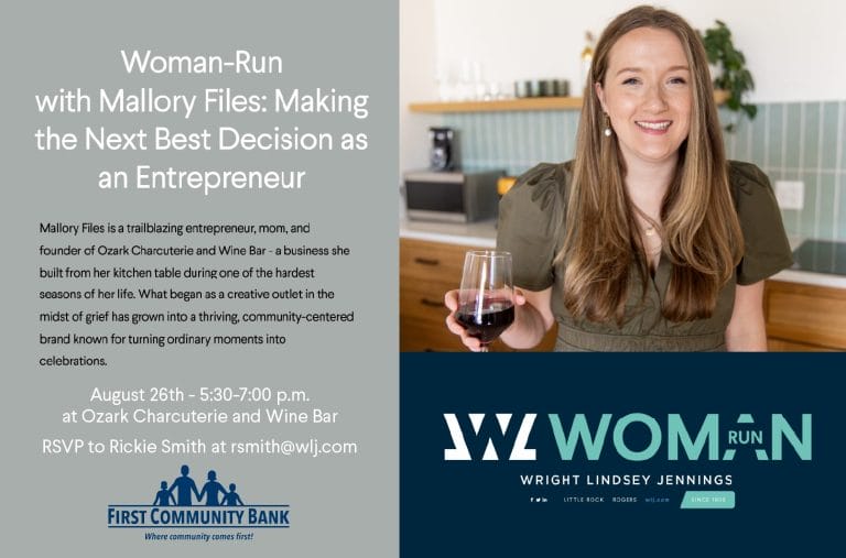 Join Woman-Run for happy hour on Tuesday, August 26, featuring Mallory Files, the founder of Ozark Charcuterie and Wine Bar.