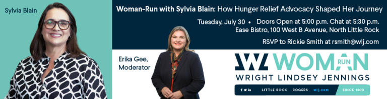 Join Woman-Run for happy hour on July 30th to hear from Sylvia Blain, the new CEO of the Arkansas Hunger Relief Alliance. Sylvia will join moderator Erika Gee to share her professional journey with us and the inspiration that led her to become involved in hunger relief missions. This work has shaped her as an individual and guided her career development. Sylvia will also let us know how to get involved to fight food insecurity in Arkansas.