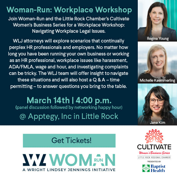 Join Woman-Run and the Little Rock Regional Chamber’s Cultivate Women’s Business Series for a Workplace Workshop: Navigating Workplace Legal Issues.